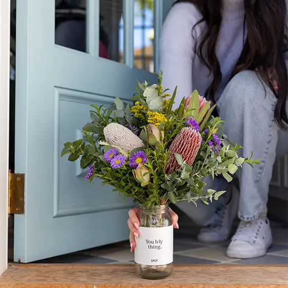 If you’re sending your posy to one of our same day delivery zones – Melbourne, Geelong, Mornington Peninsula, Sydney, Central Coast, Wollongong, Brisbane, Gold coast, Perth, Fremantle or Adelaide – we have two styles of posies that you can buy – our LVLY Flower Jars product and our LVLY Native Posy product. The LVLY Flower Jars are made up of locally grown, in-season flowers that are typically in pastels with foliage. The LVLY Native Posy will be made up of a mixture of Australian Native flowers with gum.