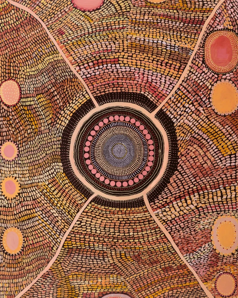 The artwork at the centre of this collaboration “Jaanymili” depicts a coming together of wonderful energy. In the words of artist Melissa Greenwood, “the circles around the outside of the print are neighbouring tribes, friends and family who journey along the pathways (lines) and meet in the middle to share stories, culture, food and celebrations.”